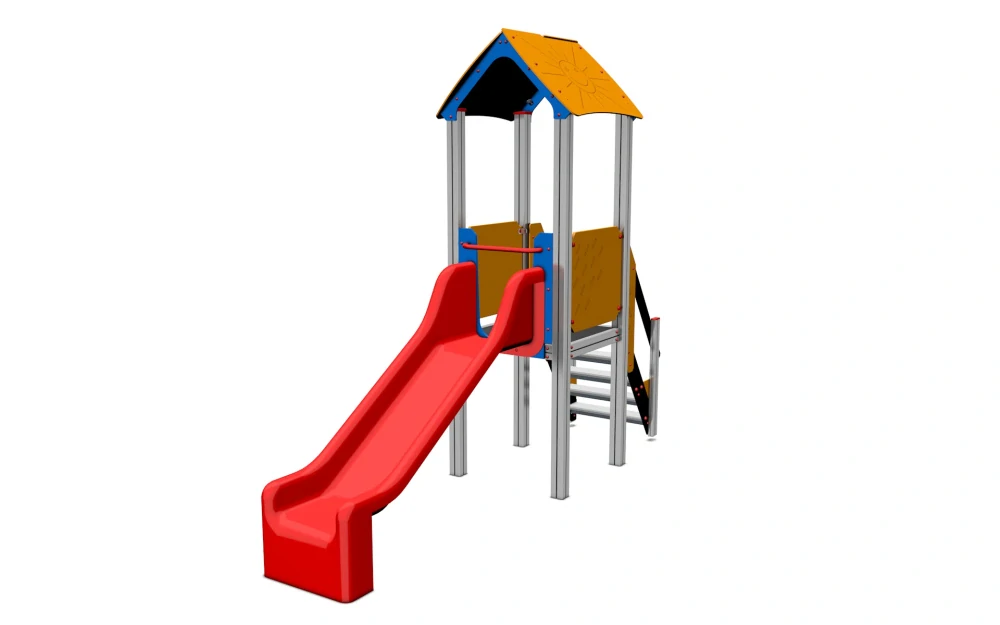 Jeden z nejklasičtějších a nejoblíbenějších herních prvků - skluzavka se schody. Zde i se zastřešenou věží Dopřejte dětem radost z klouzání! Doplněna o kovovou tyč v místě nasedání pro větší bezpečnost.