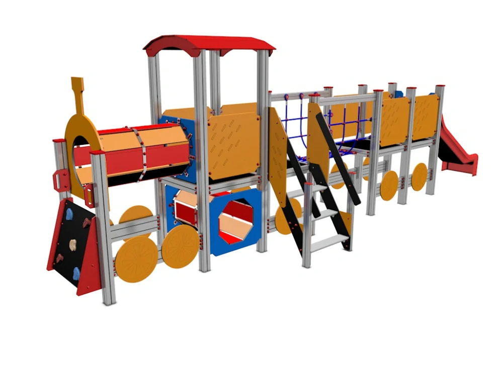 Na zábavném modelu připomínající lokomotivu propojenou se síťovou lávkou a vagónem se vyřádí děti stejně dobře jako na jiné prolézačce. Vhodná pro rozvíjení fantazie, pohyblivosti, motoriky a obratnosti. Vhodný doplněk dětských hřišť a zahrad mateřských škol.